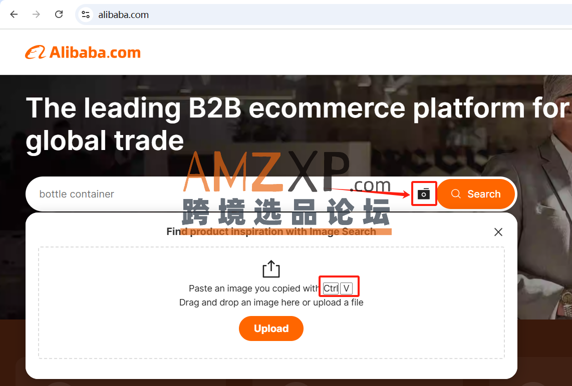 2、打开阿里巴巴国际站alibaba.com,点开照相机按钮,按下键盘CTRL+V快捷键粘贴刚才复制的图片