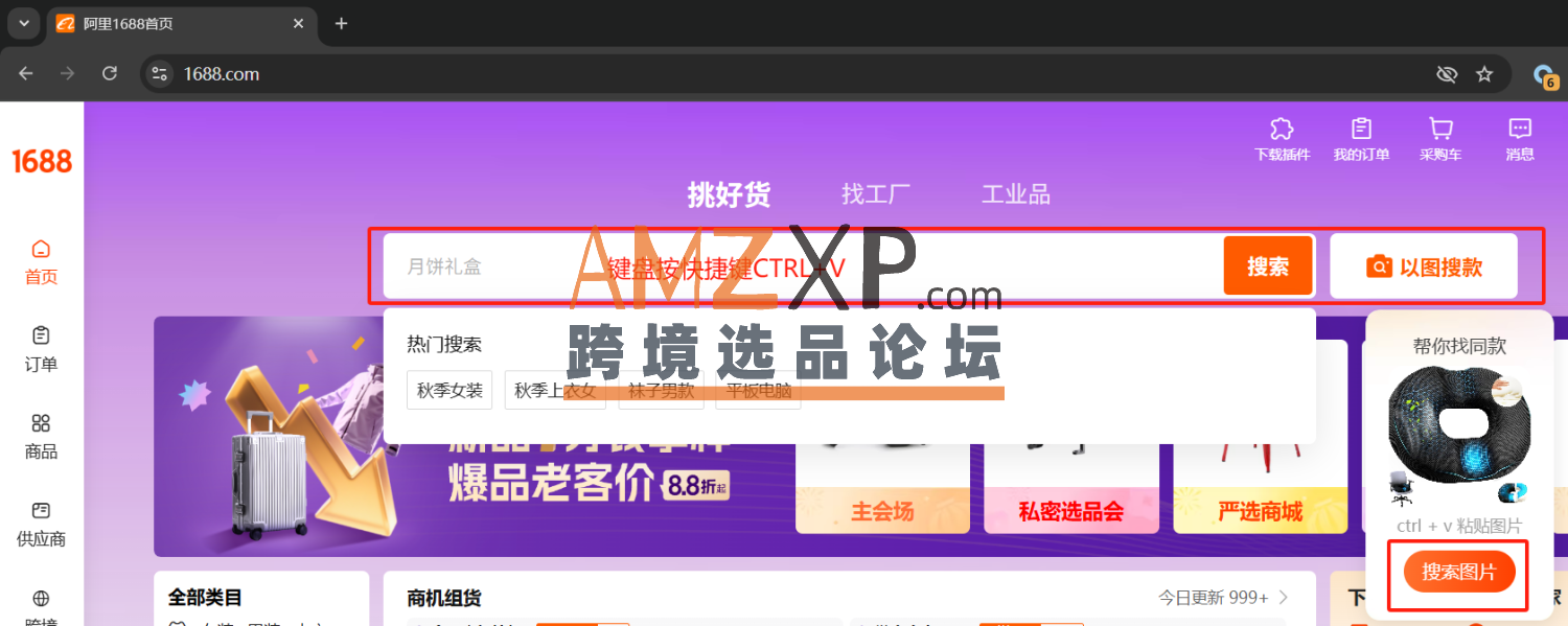 2、国内阿里巴巴也支持以图搜图,打开1688.com首页,按下键盘CTRL+V,点击搜索图片按钮