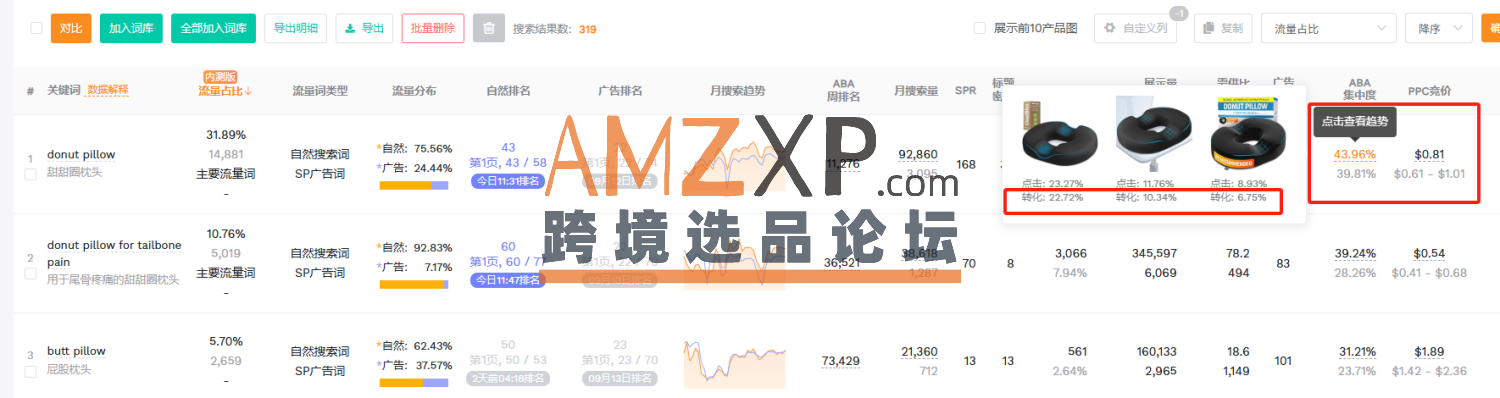 先看donut pillow这个词的ABA集中度里的数据可见做的最好的ASIN转化率在6.75-22.72%之间,这意味着做的最好的ASIN,消费者看到他们的链接要点4-15次(计算方法1/转化率,即100/22.72和100/6.75)才能出一单,而广告点一次的CPC(也可以叫PPC每次点击付费)是0.81左右。那么出一单的广告成本就是3.24-12.15美金之间(4x0.81-15x0.81),这个还是理想状态下的广告转化成本,实际转化率可能偏低或者CPC更高,那么转化成本就更贵了。